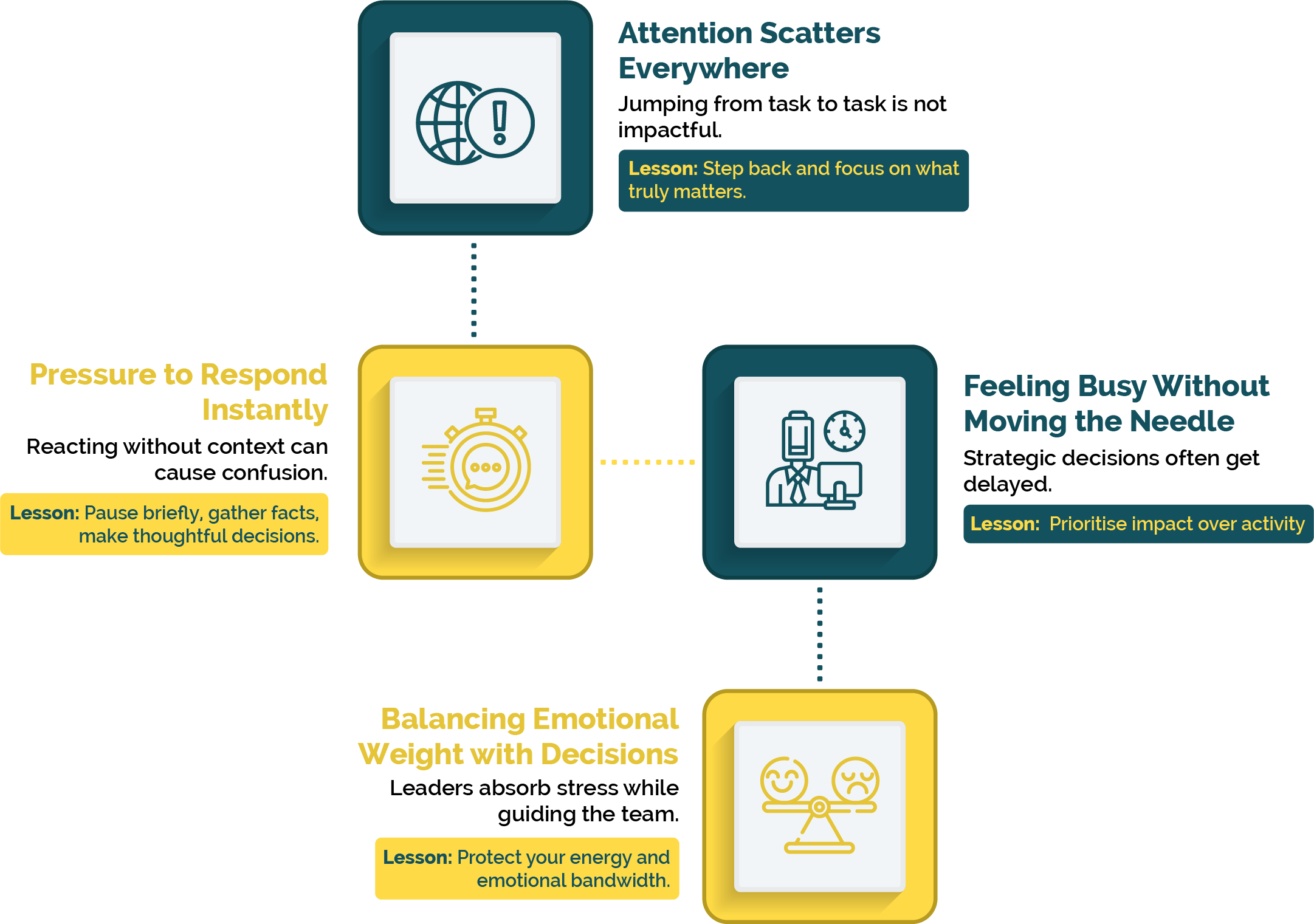 The sense of urgency during a crisis only amplifies this effect. Everything feels pressing, creating the illusion of productivity as leaders respond to every small demand. At the same time, the sheer volume of decisions, information and emotional input creates cognitive overload, making it harder to prioritise effectively.